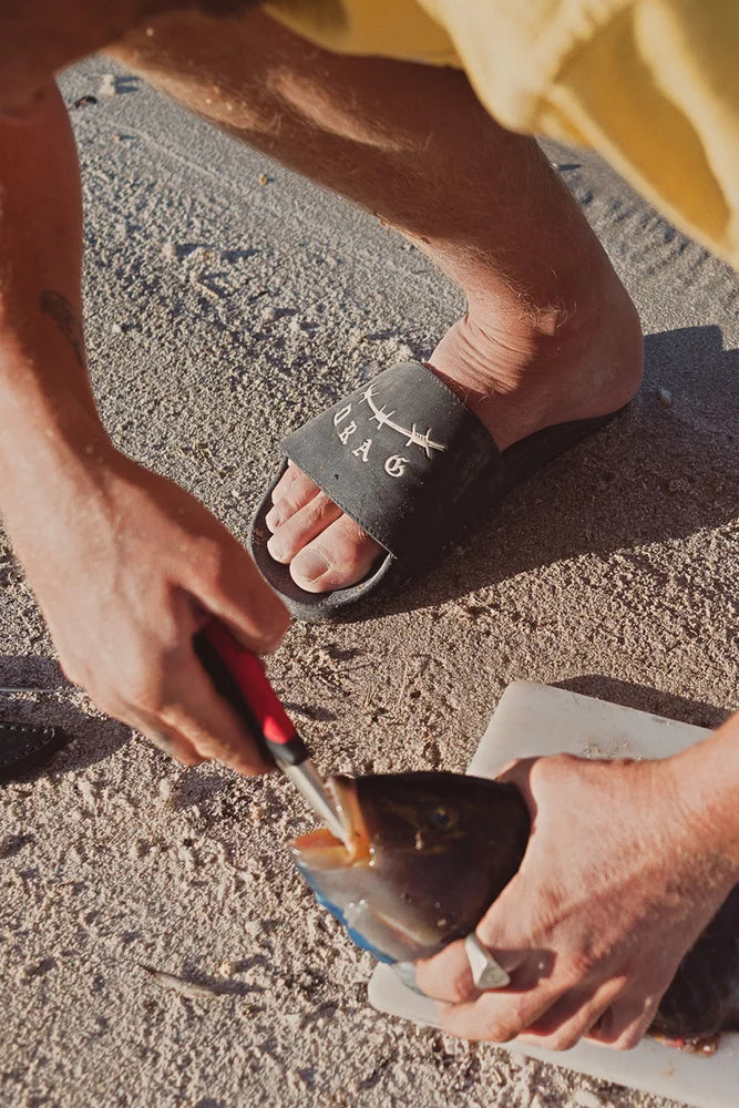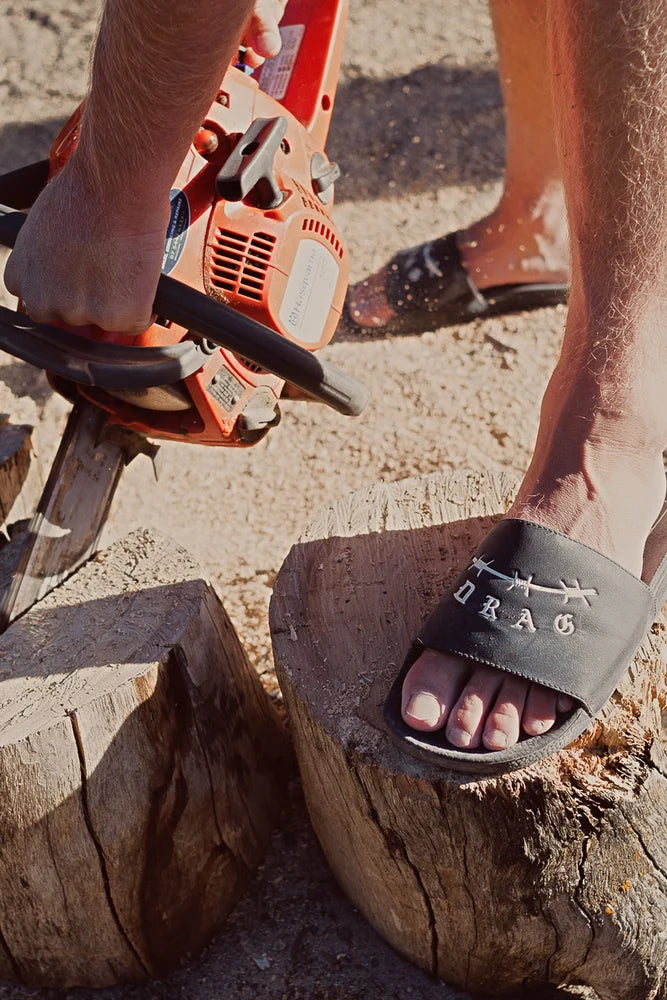 Ultra-durable, lightweight PU outer sole with classic synthetic leather foot strap for general home, street or desert wear. Showcasing the VANS x DRAG proof of origin logowork to make your presence felt.